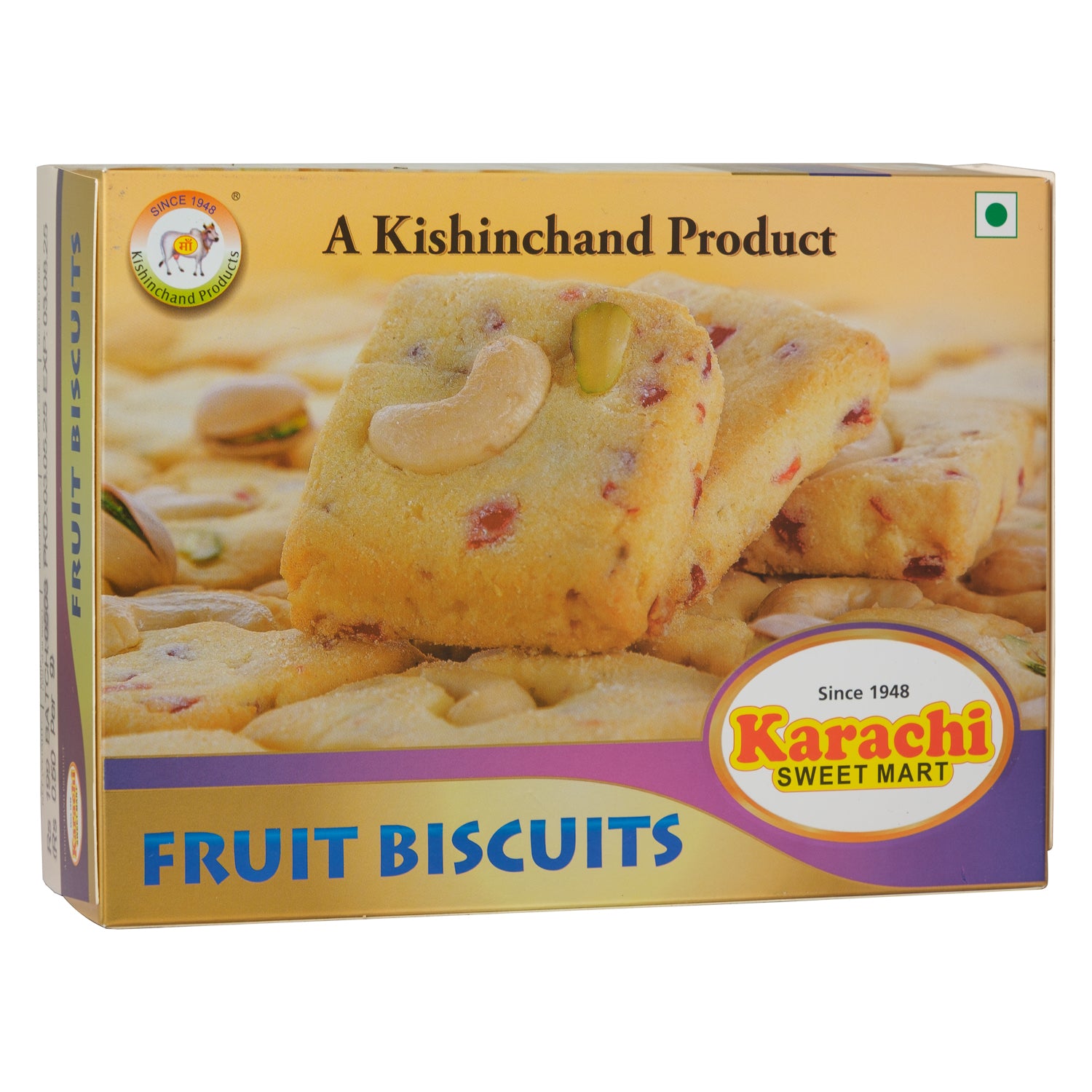 Experience a burst of flavor in every bite with our Fruit Biscuits, handcrafted by Karachi Sweet Mart, a trusted name under the Kishanchand brand. Made with the finest ingredients — wheat flour, sugar, milk solids, papaya, cashews, pistachios, and a touch of custard powder — these biscuits combine crunch, sweetness, and rich fruity notes for a delightful treat.